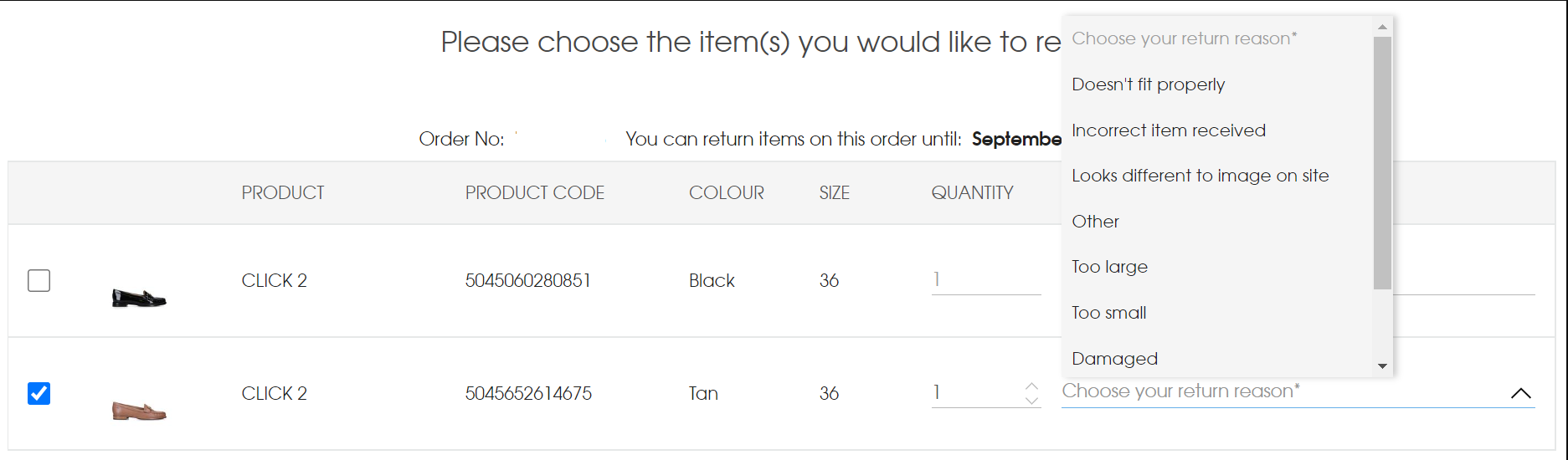 - Select the items you’d like to return and the return reason.